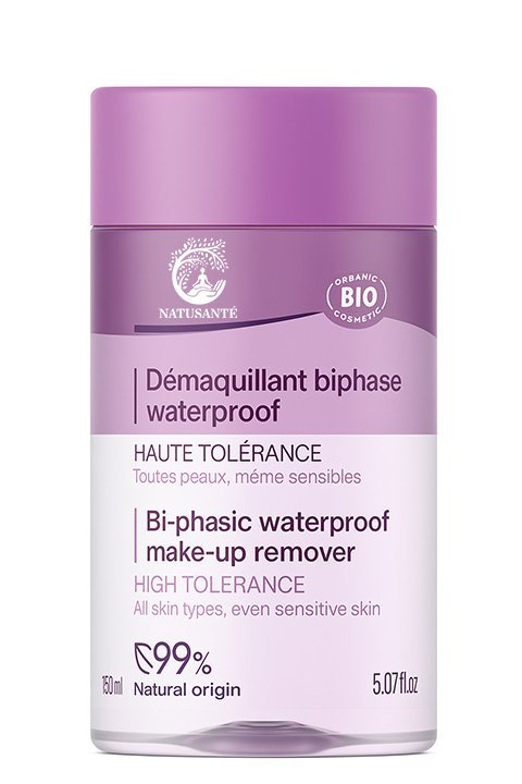 Le démaquillant biphase waterproof NATUSANTÉ élimine efficacement le maquillage résistant à l’eau tout en respectant la sensibilité de la peau et du contour des yeux. Sa formule haute tolérance est adaptée à tous types de peaux, même les plus sensibles, laissant la peau propre, douce et sans résidu gras.