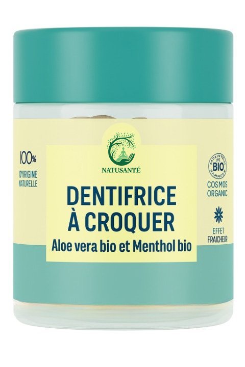 Le dentifrice à croquer BIO NATUSANTÉ associe l’aloe vera bio apaisant au menthol bio rafraîchissant pour une hygiène bucco-dentaire efficace, respectueuse des dents et des gencives, tout en procurant une haleine fraîche longue durée. Sans fluor ni sulfate, il s’intègre parfaitement dans une routine zéro déchet.