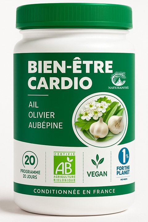 Formule naturelle à base d’ail, d’olivier et d’aubépine pour favoriser le bon fonctionnement du cœur et soutenir une circulation sanguine saine.