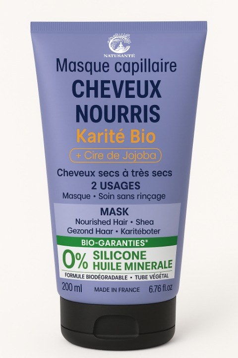 Le Masque Capillaire Cheveux Nourris Karité Bio + Cire de Jojoba de NATUSANTÉ est spécialement conçu pour les cheveux secs à très secs. Ce masque 2 en 1 peut être utilisé en soin nourrissant ou en soin sans rinçage pour redonner force et nutrition aux cheveux, tout en facilitant le coiffage et en apportant douceur et brillance.