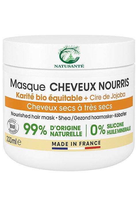 Le Masque Cheveux Nourris de NATUSANTÉ, enrichi en karité bio équitable et cire de jojoba, nourrit intensément les cheveux secs à très secs. Il hydrate en profondeur, répare les cheveux abîmés et facilite le démêlage tout en apportant souplesse et douceur aux cheveux, sans les alourdir.