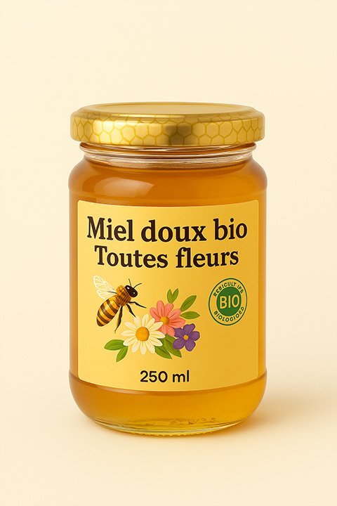 Miel doux bio issu de diverses fleurs, récolté de manière biologique, offrant un goût naturel sucré et une texture onctueuse.
