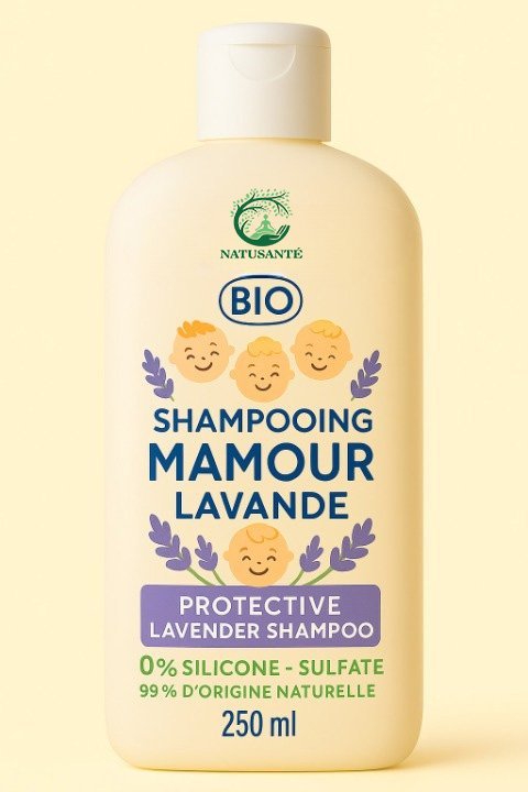 Le shampooing protecteur NATUSANTÉ Mamour Lavande nettoie en douceur les cheveux délicats des bébés et enfants tout en respectant leur cuir chevelu fragile grâce à sa formule douce au parfum apaisant de lavande.